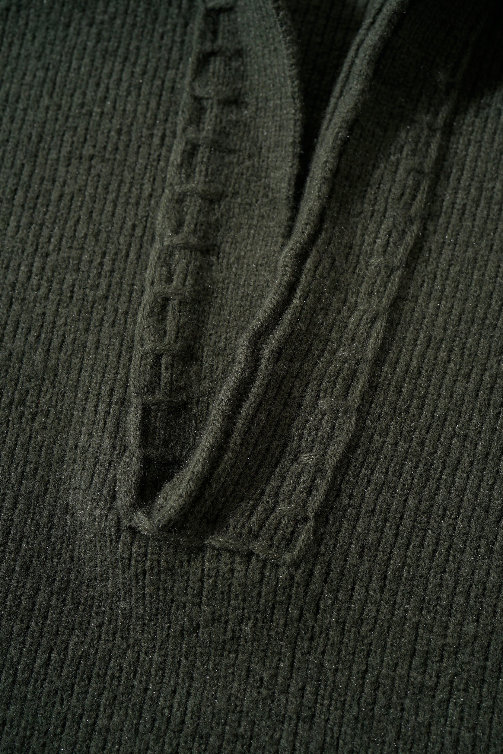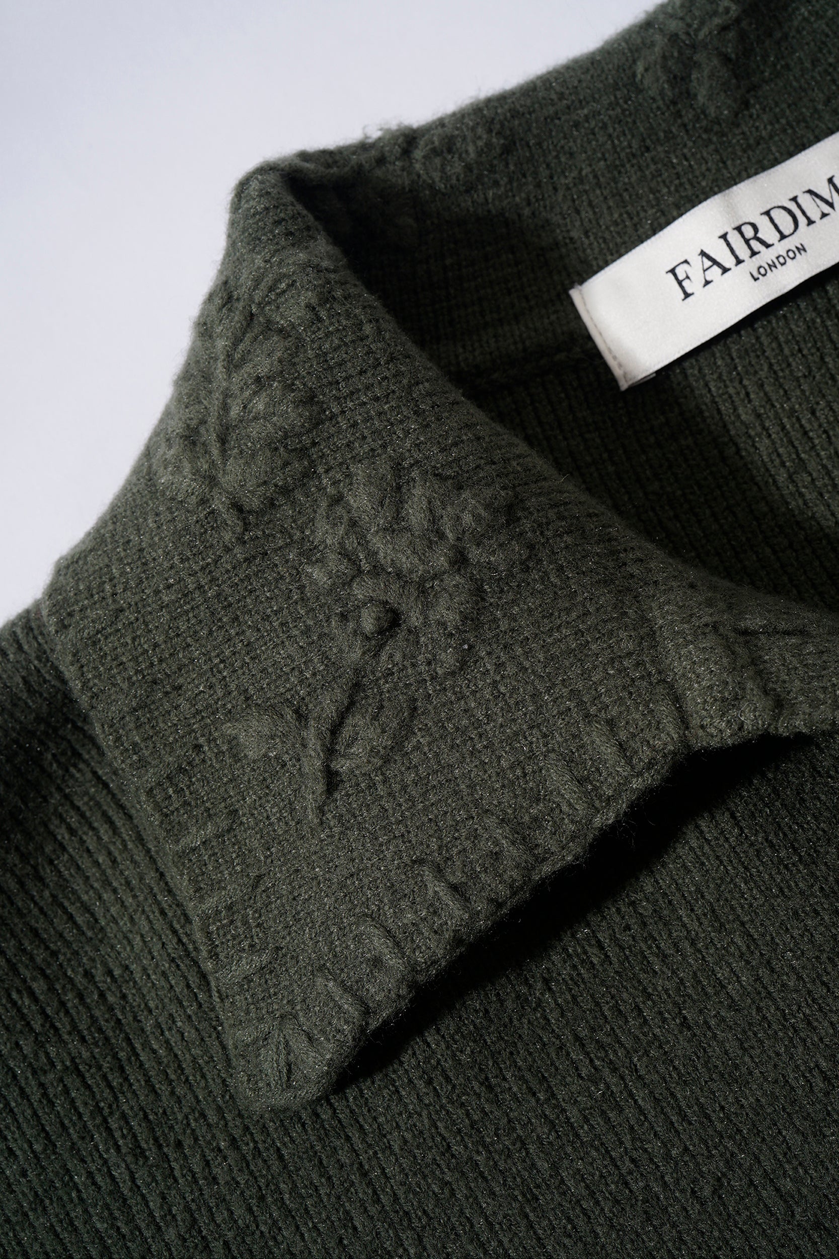 Crafted from a soft mid-weight wool blend in deep olive, the Arbor Knit features a relaxed silhouette with an open collar and subtle floral embroidery. Ribbed cuffs and hem add structure, while the soft handfeel offers texture, comfort, and versatility for layering or standalone wear.
