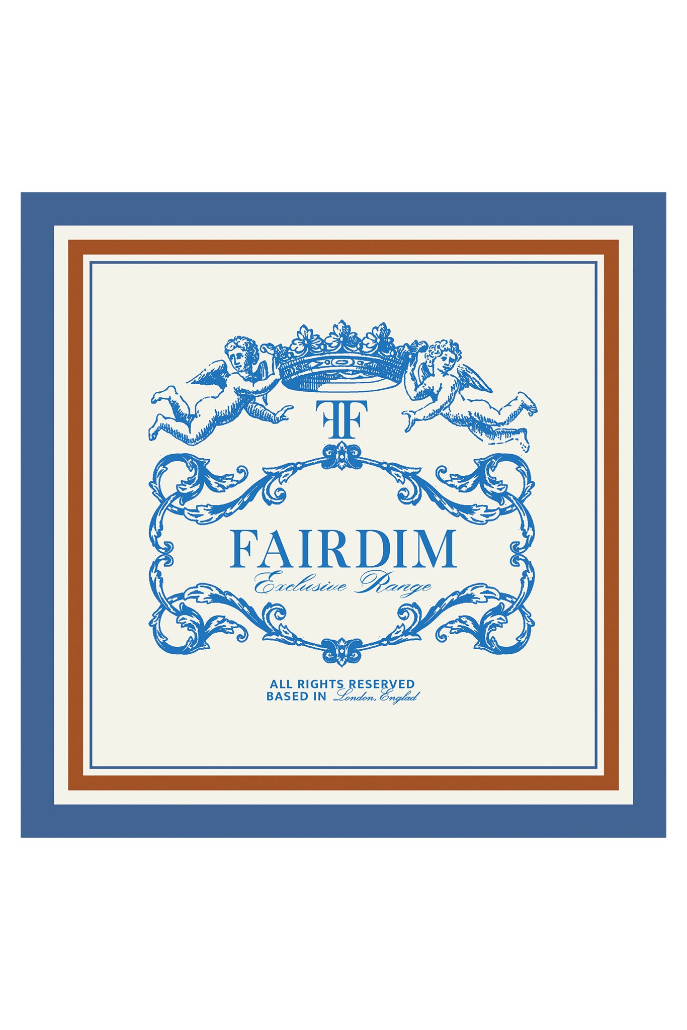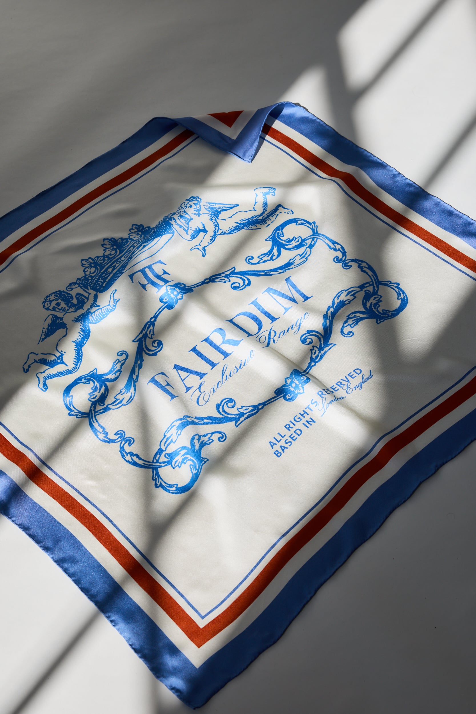 A signature piece from our earliest collection. Archive I features the Fairdim emblem, surrounded by baroque-inspired cherubs and ornamental flourishes. Crafted in 100% silk with a light ivory base, framed by an azure motif and deep red border. Designed for versatile styling—worn around the neck, hair, or as an accent piece.