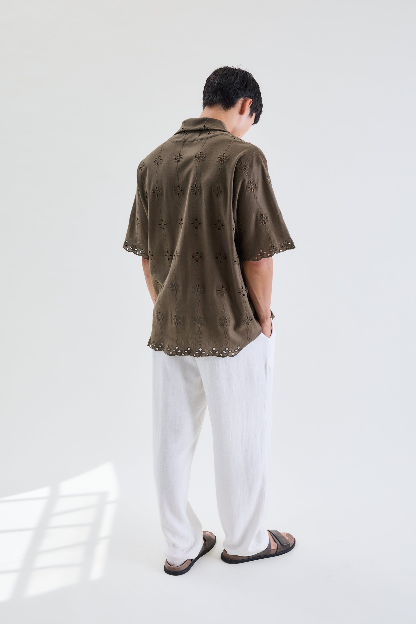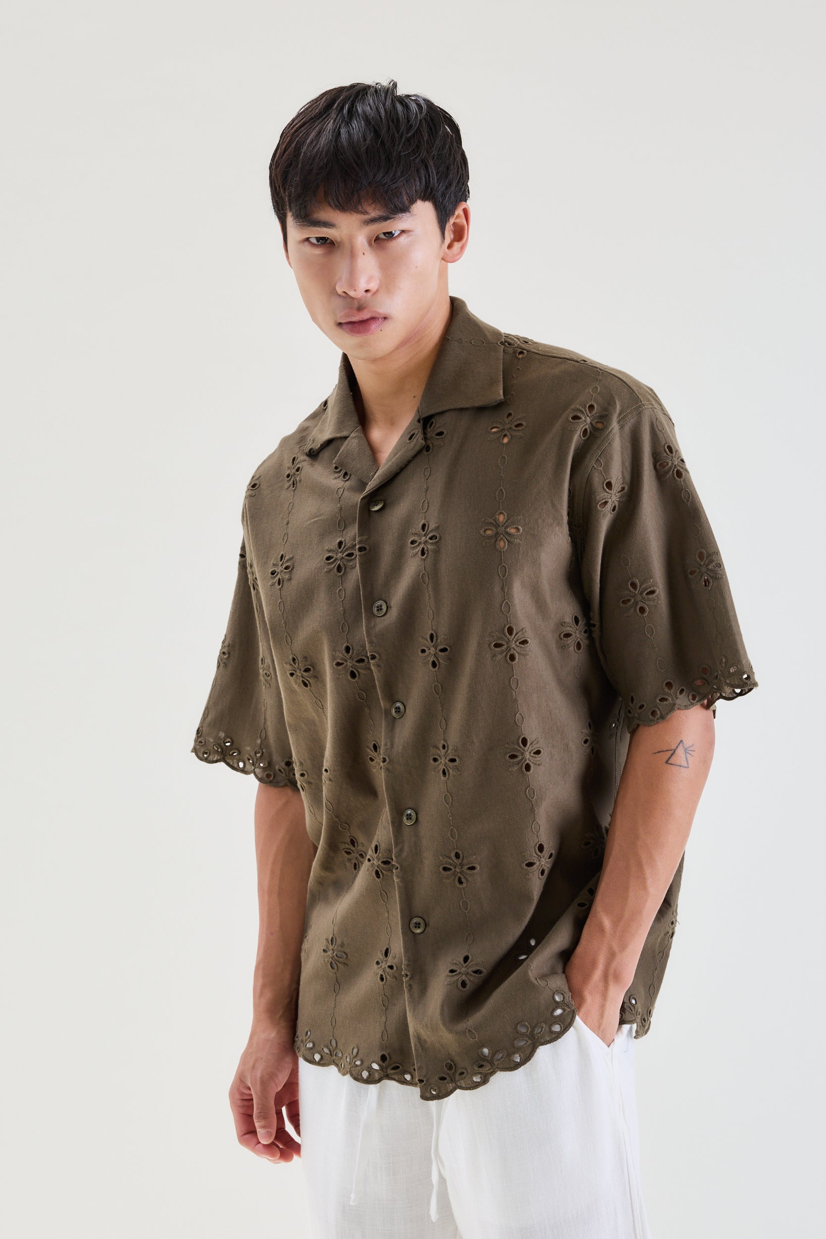 Tailored from a lightweight linen blend, detailed with open floral embroidery throughout. The pattern creates soft negative space across the surface, giving the shirt a light-catching, tactile quality. Designed with a relaxed fit, short sleeves, and a straight hem, it balances ease with quiet intricacy. Finished in a washed olive tone that complements the texture of the fabric.