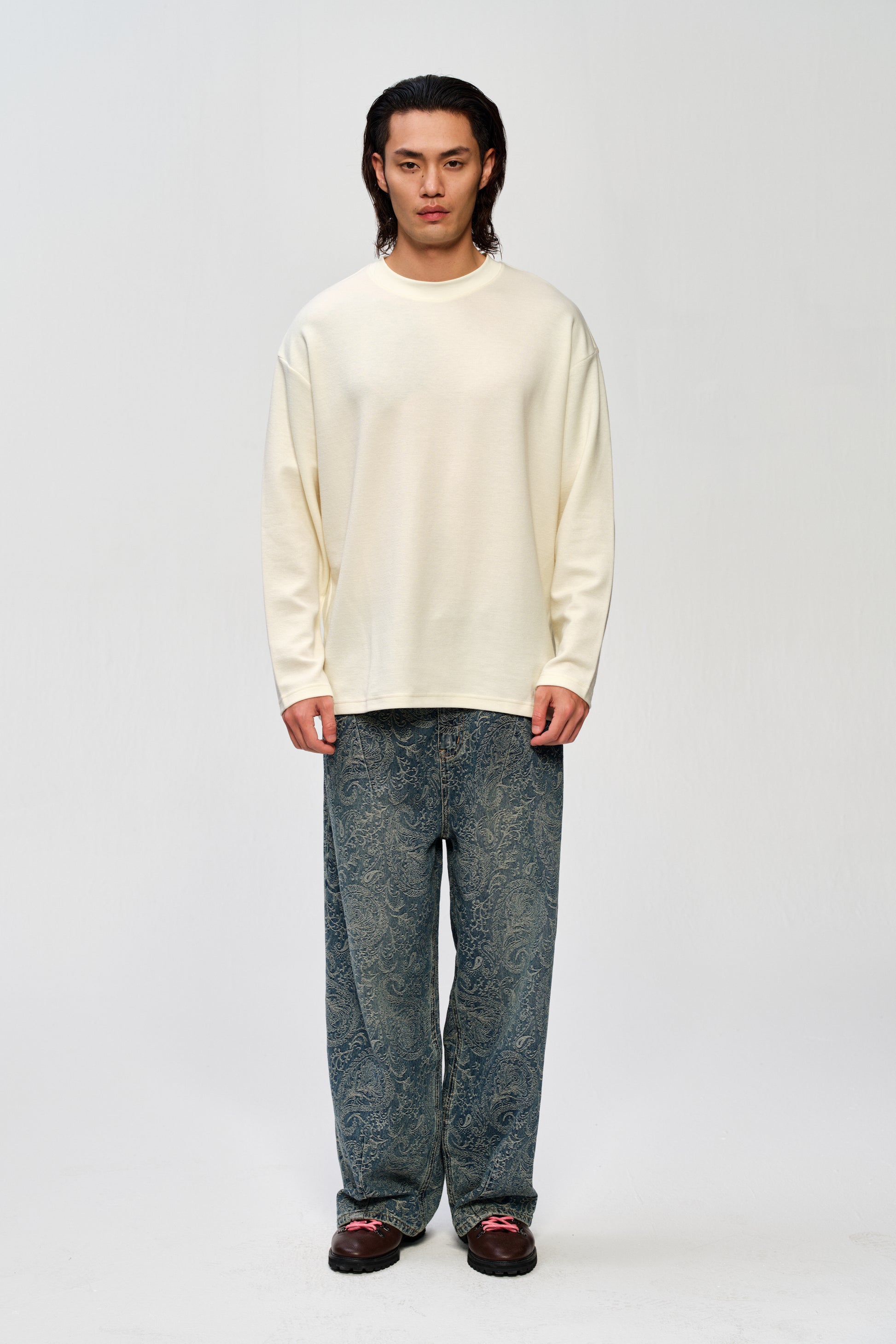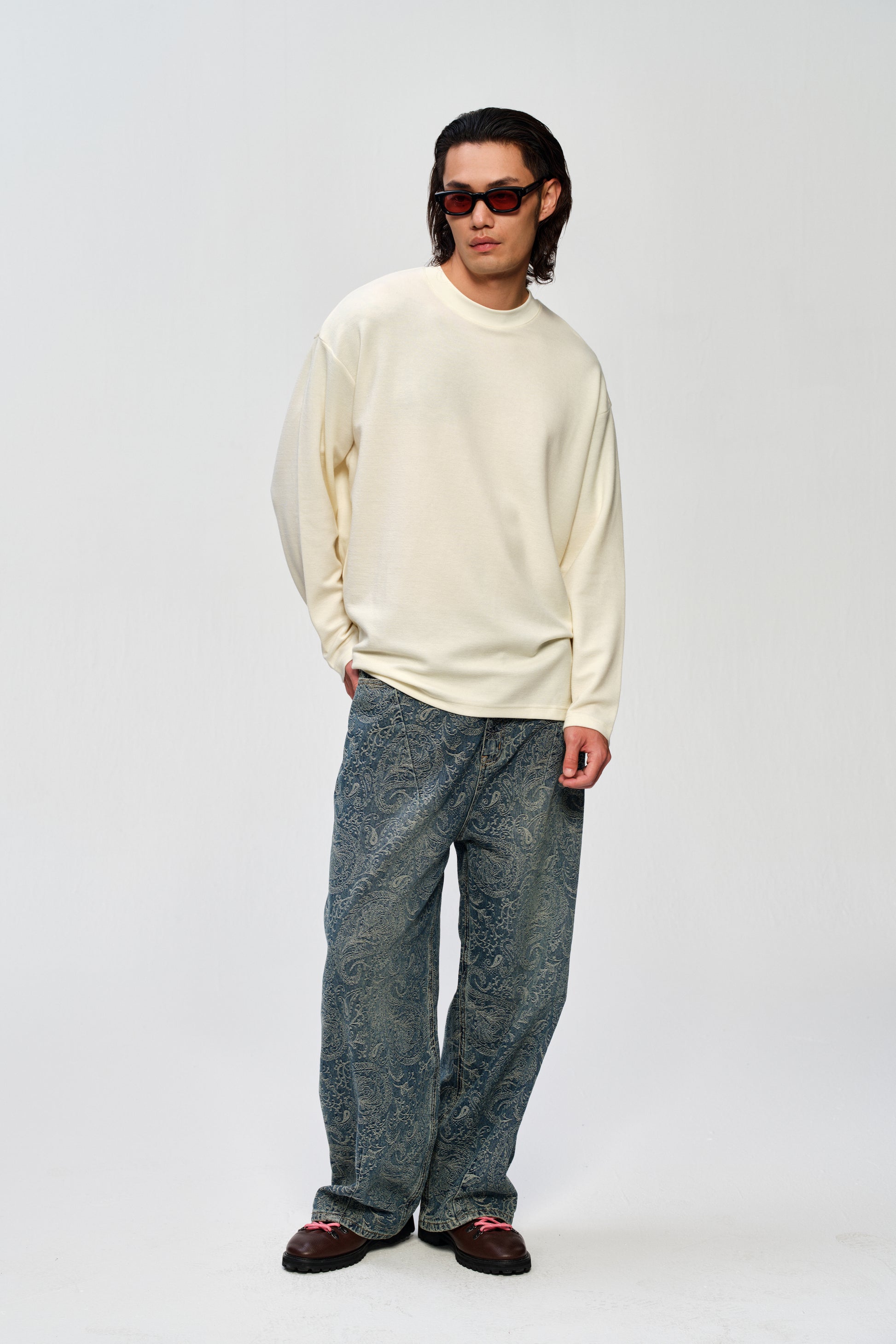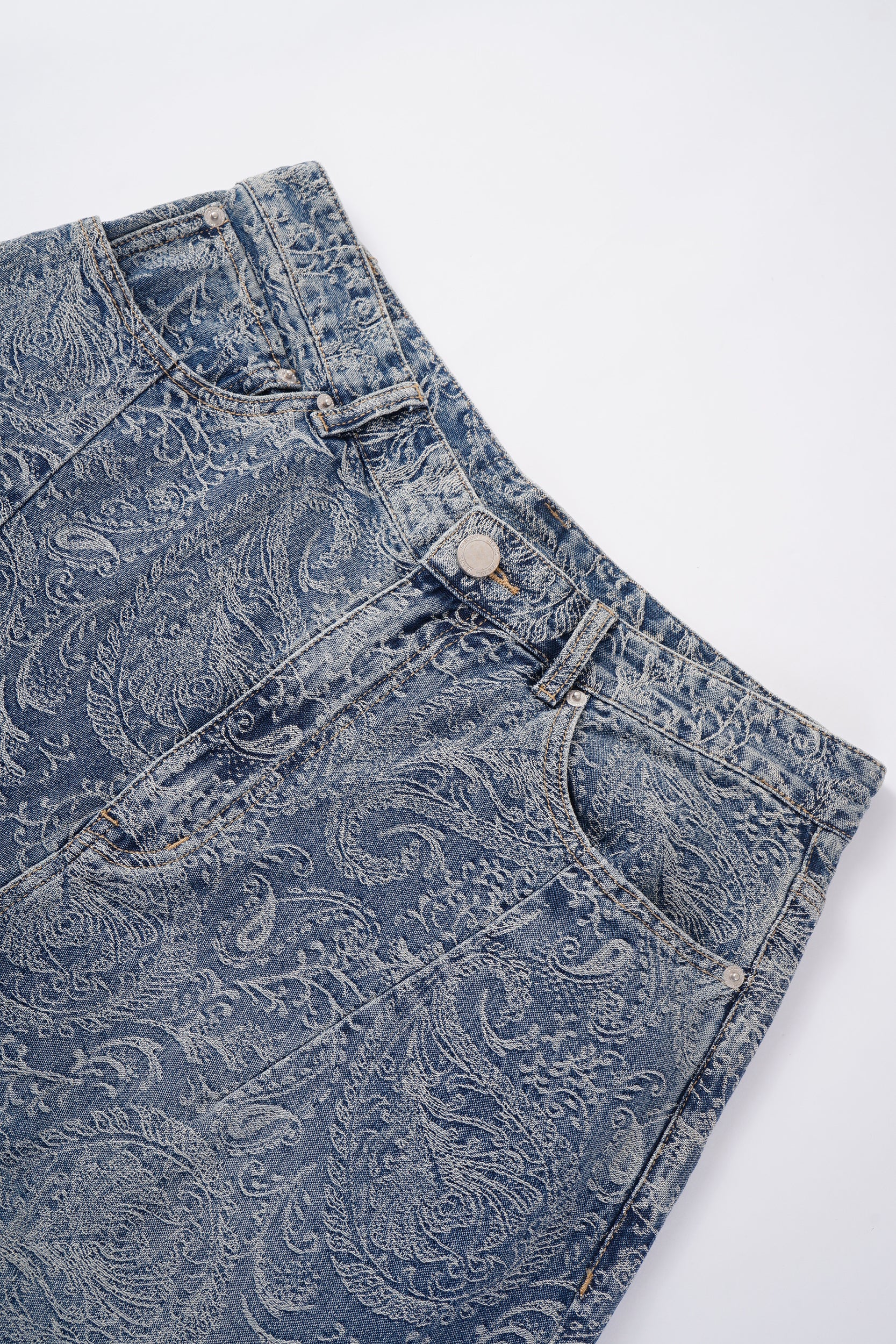 Crafted from premium cotton denim with an all-over paisley etching, the Etched Jeans blends refined craftsmanship with modern ease. Designed in a relaxed straight-leg silhouette, it offers structure, comfort, and subtle texture that elevates everyday wear.