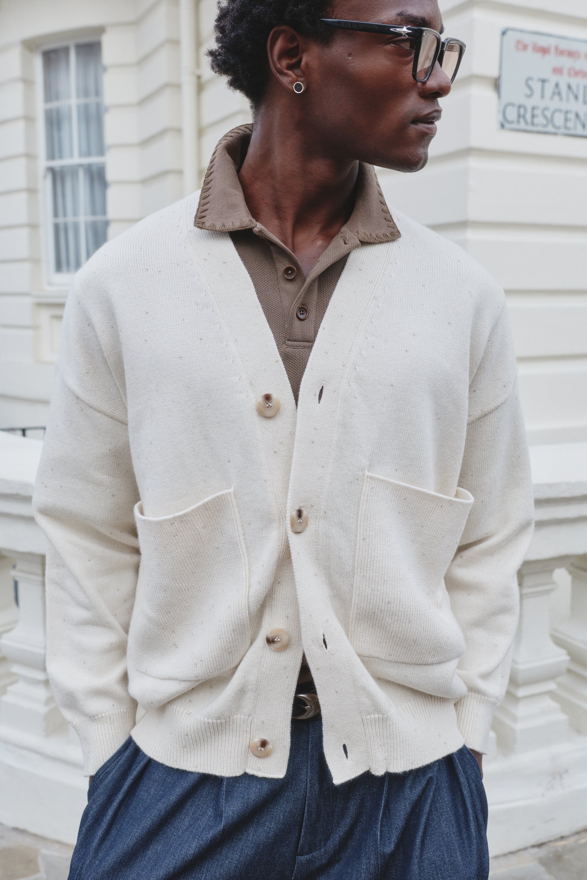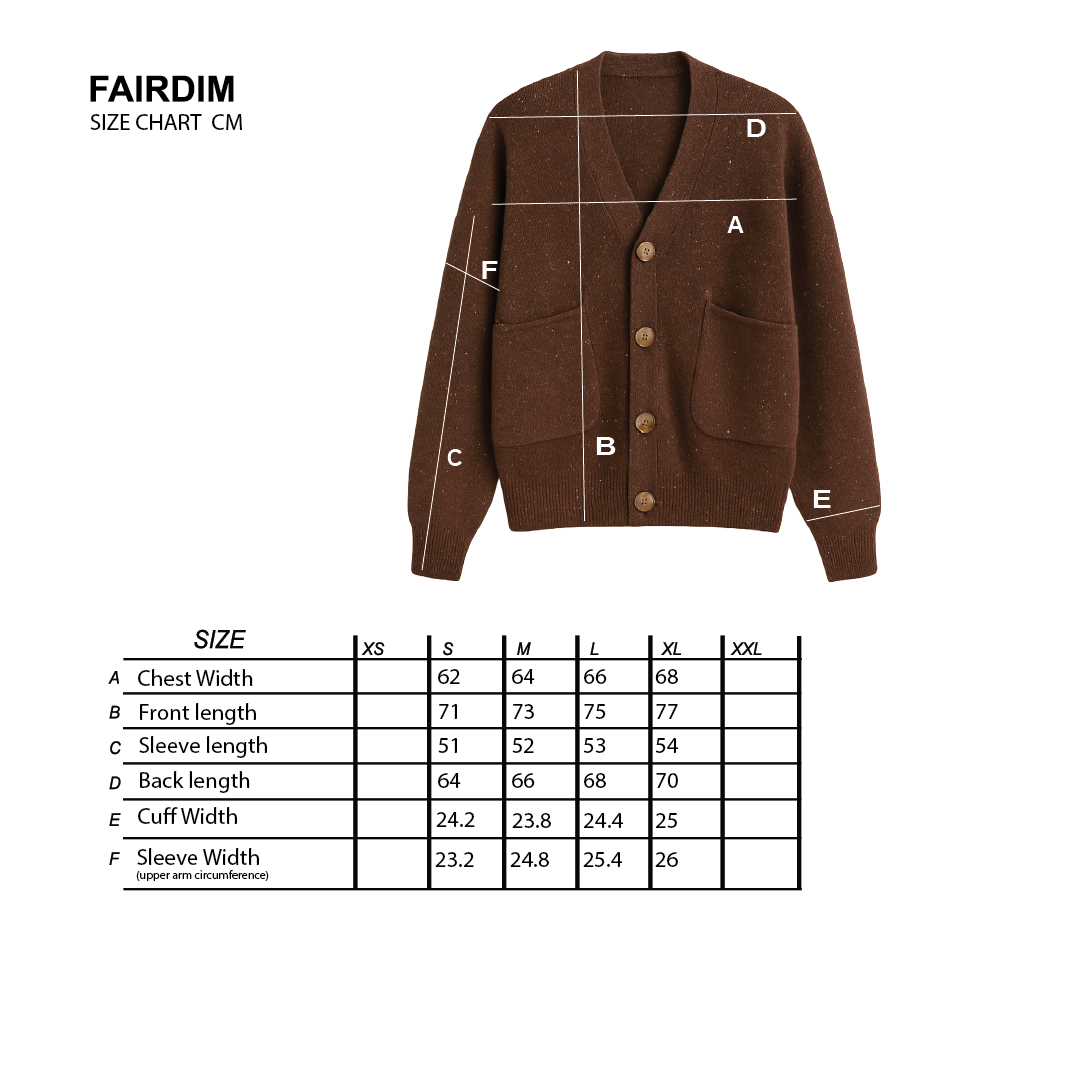 Knitted from a warm wool-blend yarn with a flecked, speckled texture,c Designed with a relaxed fit and dropped shoulders, it features oversized patch pockets, horn-effect buttons, and a soft handle that balances comfort with understated sophistication. The earthy brown tone with subtle flecks adds depth, making it a versatile piece for both casual layering and elevated styling.